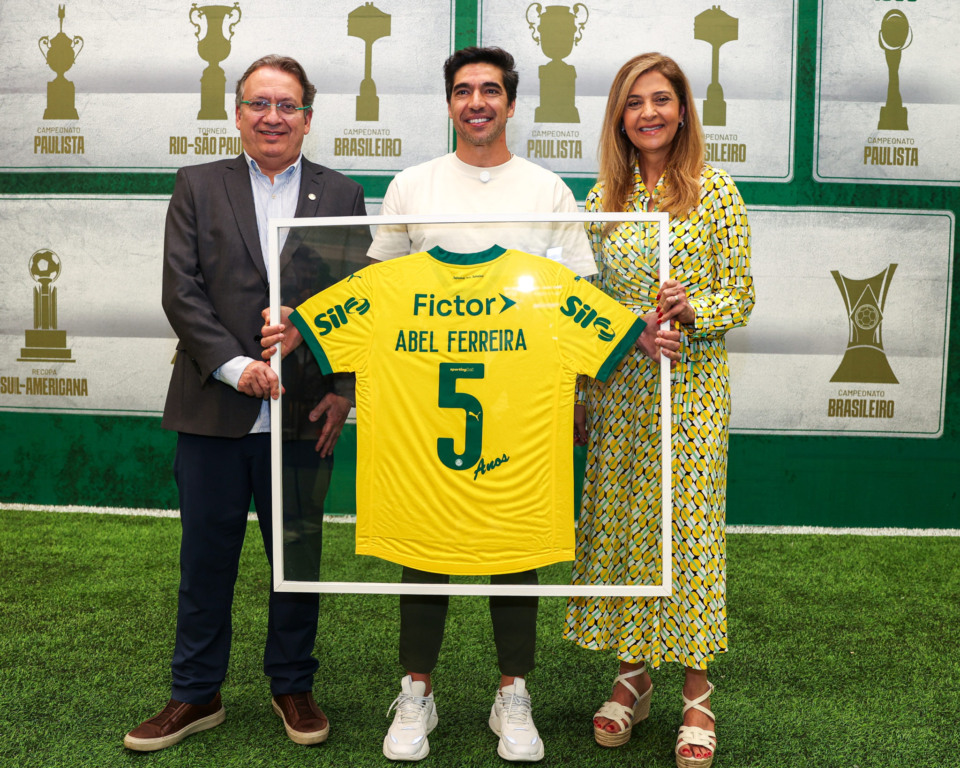 O técnico Abel Ferreira foi homenageado nesta terça-feira (4) pelo Palmeiras em celebração aos cinco anos de clube completados na semana passada. Anunciado pelo Verdão no dia 30 de outubro de 2020, o português recebeu uma camisa comemorativa da presidente Leila Pereira e do vice-presidente Paulo Buosi na Academia de Futebol.
