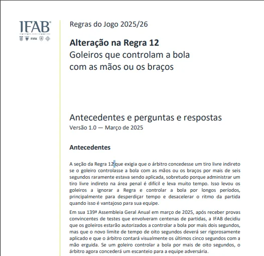 A FIFA adotará a nova regra a partir da disputa do Mundial de Clubes, em junho, que será realizado nos Estados Unidos.