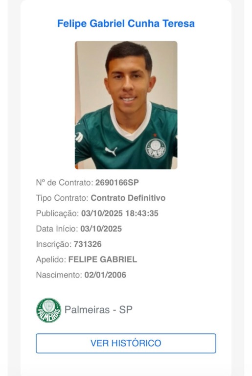 O Palmeiras fechou a contratação de Felipe Teresa nesta semana, após o jovem rescindir o contrato com Flamengo em setembro. O atacante de 19 anos foi o autor do gol do título Mundial Sub-20 do clube carioca em 2024.