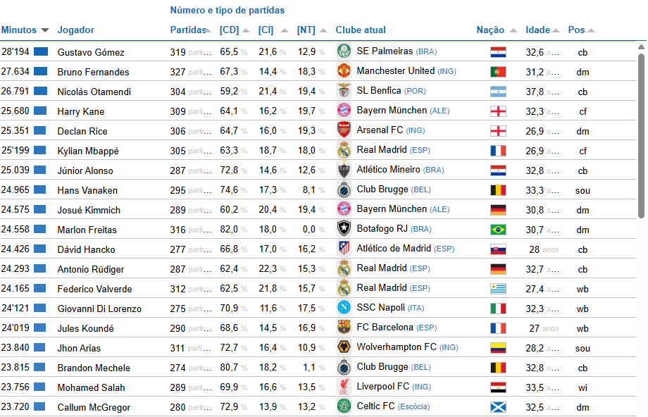 Segundo o levantamento, o defensor paraguaio acumulou 28.194 minutos em campo, considerando compromissos por clubes e seleções no período analisado. O número coloca Gómez à frente de atletas que atuam nas principais ligas da Europa e que são protagonistas em competições continentais e internacionais.