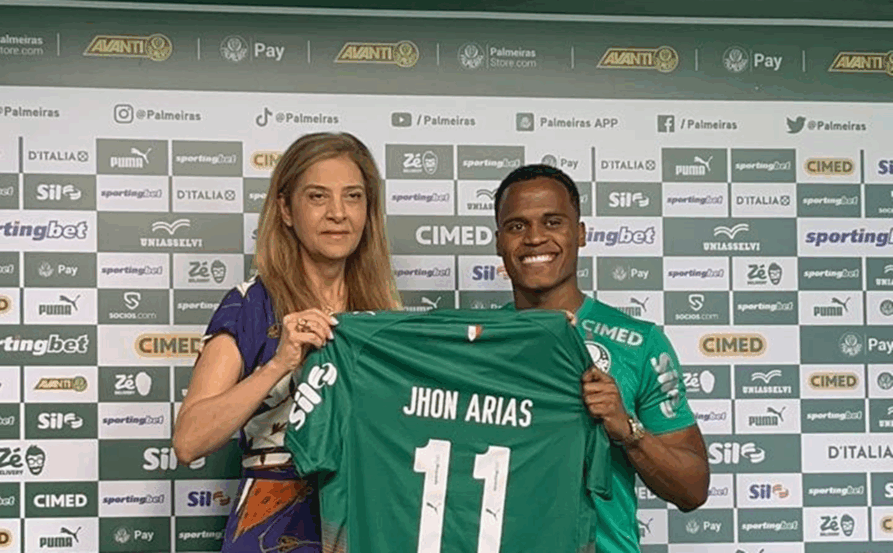 O Palmeiras apresentou oficialmente nesta sexta-feira (13), a contratação de Jhon Arias, na Academia de Futebol. Vindo do Wolves, da Inglaterra, o colombiano custou aos cofres palmeirenses 25 milhões de euros (cerca de R$ 154 milhões).
