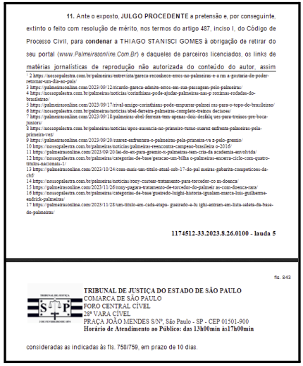 Em 10 de março de 2025, a Justiça sentenciou que Thiago Stanisci Gomes, proprietário da página ‘Palmeiras Online’, “não logrou êxito em produzir provas idôneas capazes de demonstrar que ele próprio, ou terceiro por ele contratado, tenha produzido de forma autêntica e original as reportagens jornalísticas veiculadas em seu portal, independentemente do teor das reportagens previamente publicadas pelo NOSSO PALESTRA” e que o site “utilizou recursos gramaticais como paráfrases e inversão da ordem dos trechos, conduta que não descaracteriza a reprodução não autorizada e tampouco atribui originalidade às publicações questionadas”, havendo “clara violação aos direitos autorais”.