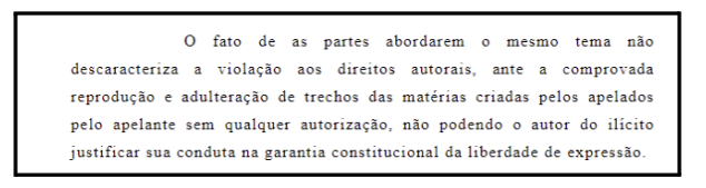 “O fato de as partes abordarem o mesmo tema não descaracteriza a violação aos direitos autorais, ante a comprovada reprodução e adulteração de trechos das matérias criadas pelos apelados pelo apelante sem qualquer autorização, não podendo o autor do ilícito justificar sua conduta na garantia constitucional da liberdade de expressão”.