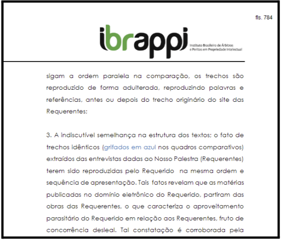 A propósito, o laudo pericial elaborado pelo IBRAPPI – Instituto Brasileiro de Árbitros e Peritos em Propriedade Intelectual Ltda apontou que as matérias publicadas no portal “Palmeiras Online” não passavam de reformulações superficiais dos textos do Nosso Palestra, com alterações meramente lexicais ou sintáticas — em verdadeiro aproveitamento parasitário, sem qualquer traço de criatividade que lhes conferisse autonomia autoral, agravado pela manifesta prática de concorrência desleal (palavras da própria perícia):