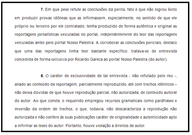 Finda a tramitação do processo e concluída a perícia técnica dos textos, confirmou-se o que já se mostrava desde o início: o site Palmeiras Online apropriou-se de conteúdos jornalísticos elaborados pelo Nosso Palestra.