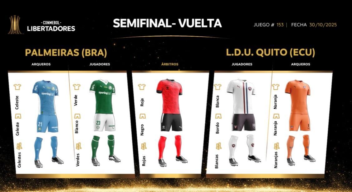 O Palmeiras entra em campo nesta quinta-feira (30-), às 21h30 (de Brasília), para enfrentar a LDU, no Allianz Parque, pelo jogo de volta da semifinal da Libertadores, após ser derrotado por 3 a 0 no primeiro jogo, em Quito. Nesta terça-feira -feira (28), a Conmebol definiu os uniformes a serem usados por cada equipe.
