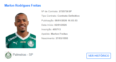 O Palmeiras anunciou no último domingo (4) a primeira contratação para temporada 2026. O Verdão assinou com Marlon Freitas, do Botafogo, capitão do clube carioca e vencedor no futebol brasileiro.