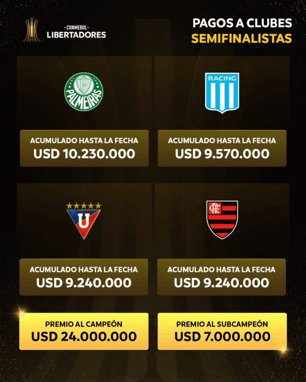Além da disputa por uma vaga na grande final, o Palmeiras também mira as premiações milionárias oferecidas pela Conmebol: o campeão da Libertadores leva US$ 24 milhões (cerca de R$ 136 milhões), enquanto o vice-campeão recebe US$ 7 milhões (R$ 40 milhões).