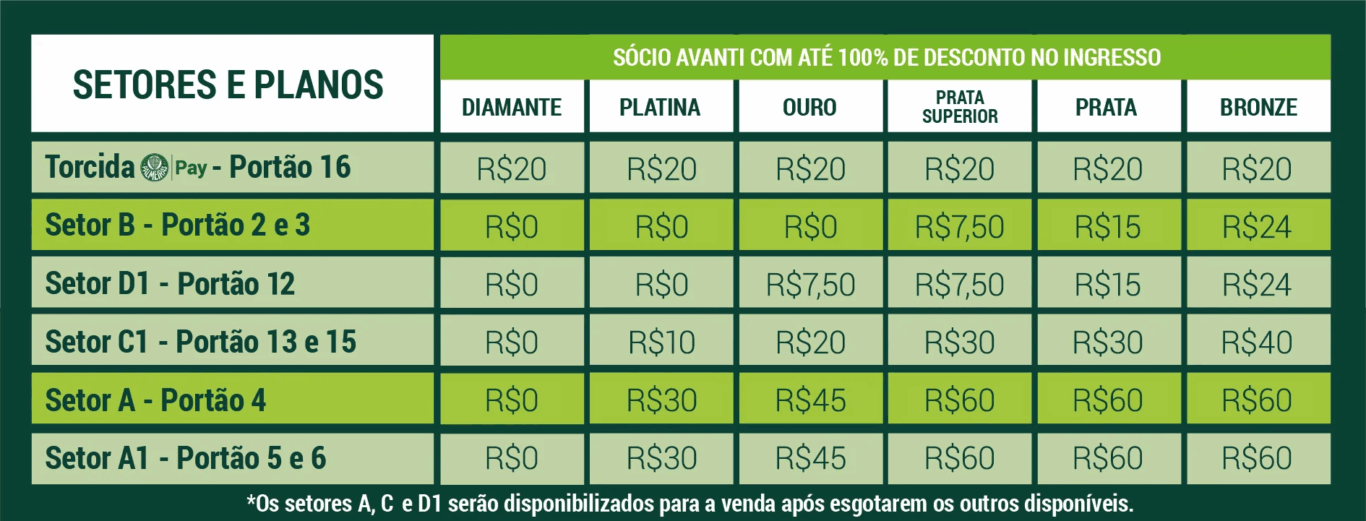 - Setor C (Portão 16 – Torcida Palmeiras Pay): R$20,00 [inteira]