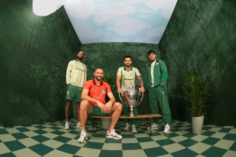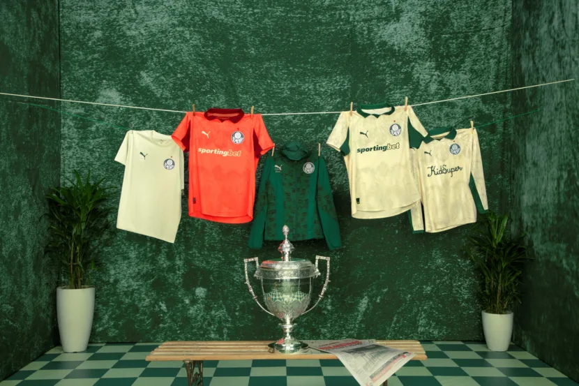 Além dos uniformes, a coleção Palmeiras – PUMA x KIDSUPER traz peças de lifestyle como camisa retrô de manga longa, camiseta gráfica, shorts, calça e jaqueta reversível — todas com o traço irreverente da KidSuper e o DNA esportivo da PUMA.